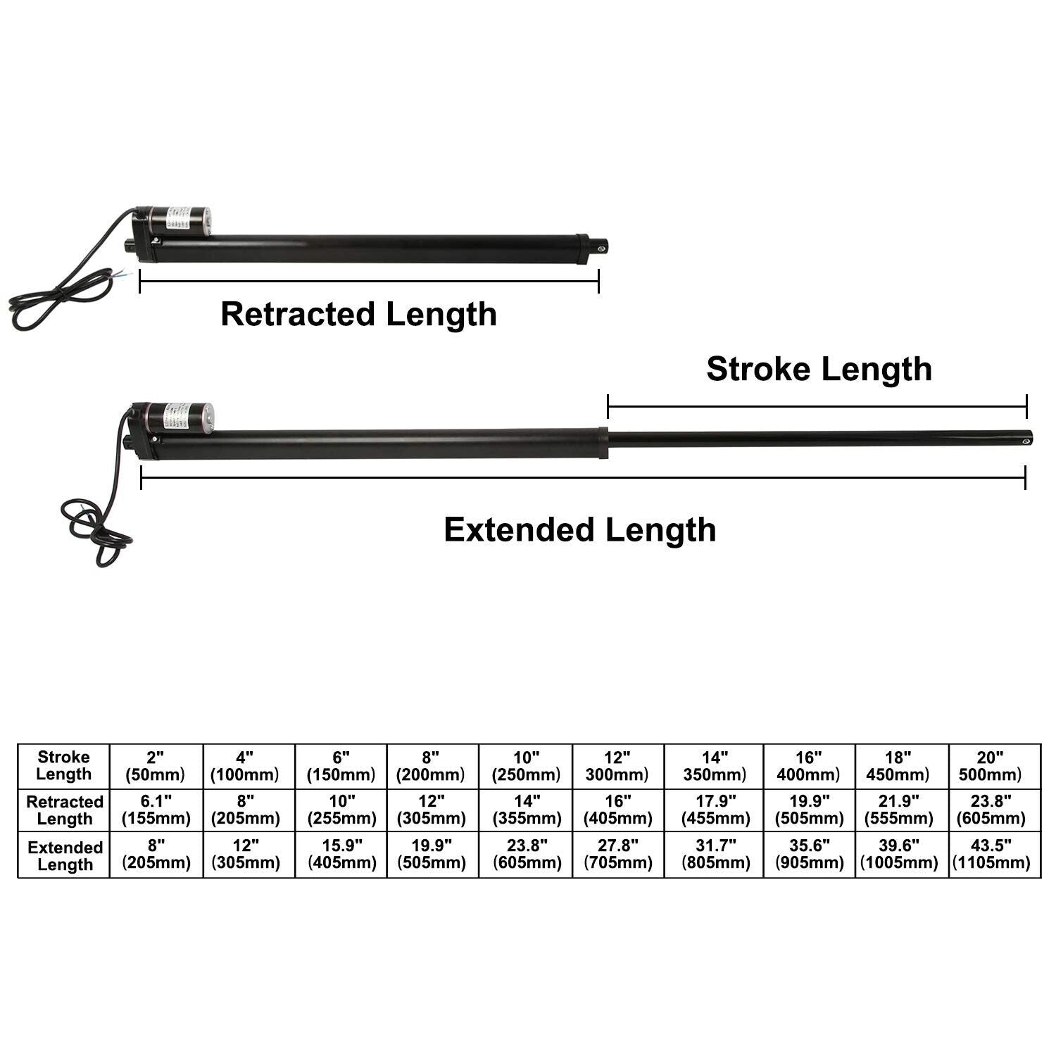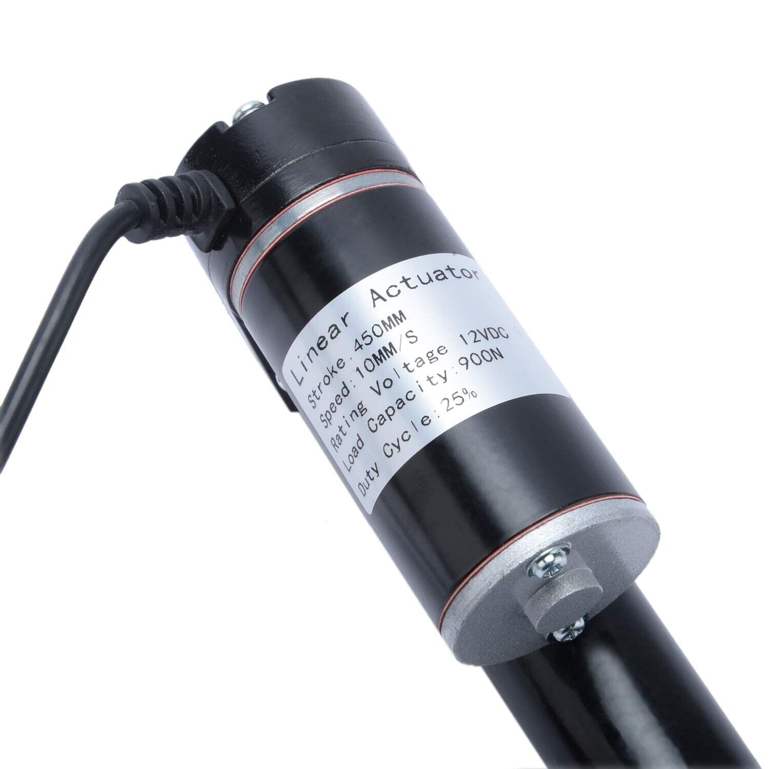 * ★ Specification: Stroke length = 450mm(18"); Retracted length = 555mm(21.9"); Extended Length= 1005mm(39.6“); Travel speed = 0.39 inches/sec (10 mm/s);Maximum current draw = 3Amps; Maximum Load = 225lbs(900N).