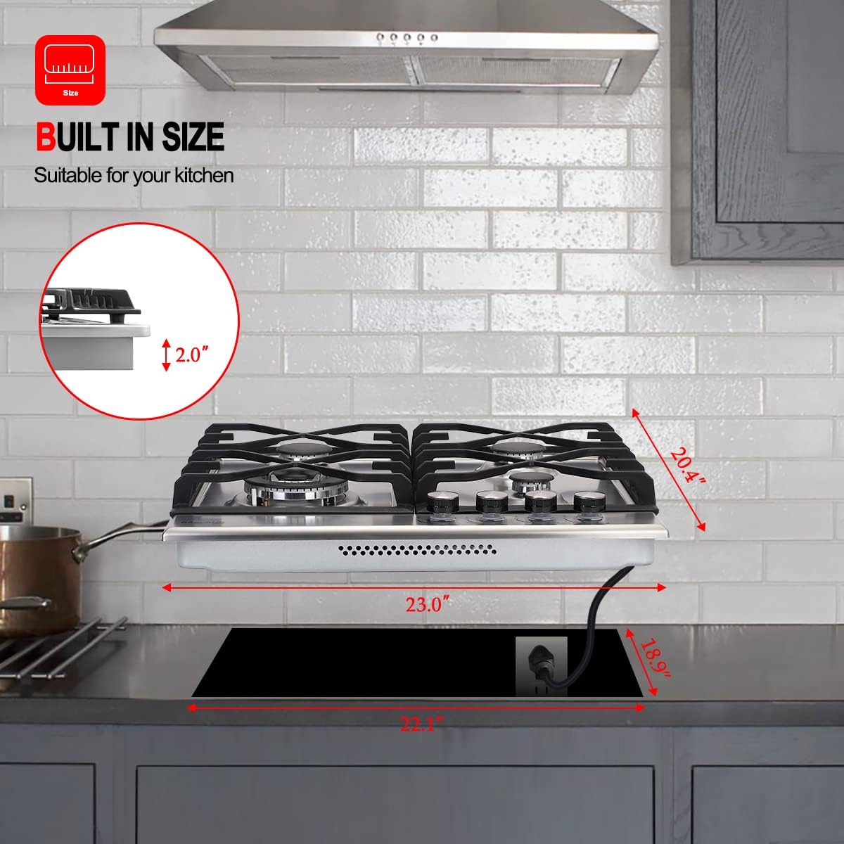 - đăElegant High-quality DesignăProduct size: 22.8'' x 19.7'' x 3.9''(580mm x 500mm x 100mm). Cut out size: 22.1'' x 18.9''(560mm x 480mm). The high quality stainless steel structure with heavy cast iron grates make its delicate appearance and long lasting durability.