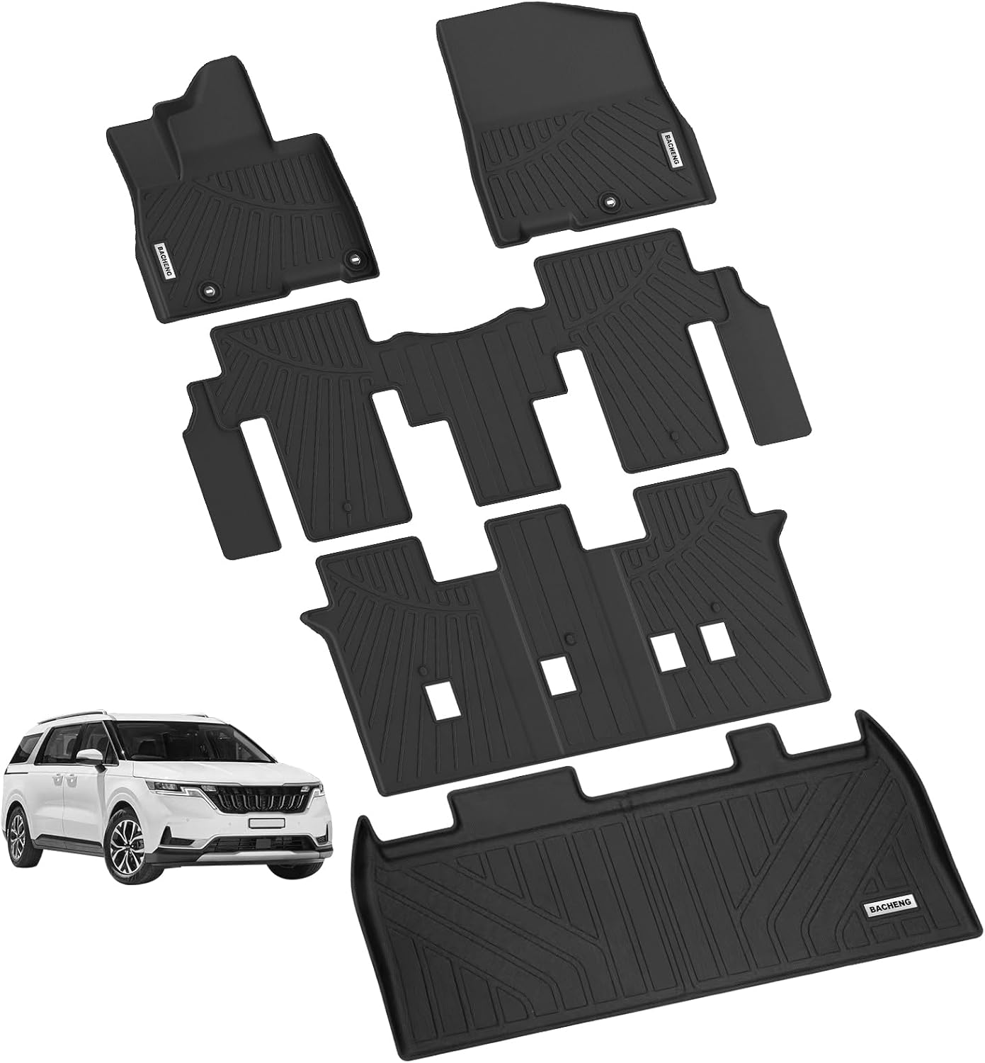- Custom Fit: BACHENG floor mats are compatible with Kia Carnival 2022-2025.(Only Fit 8 Seats Fits LX seat Package, EX and SX (NOT fit Prestige Models); 3D laser scanning technology gives full protection to both the front and back, Please remove old floor mats before installing new ones
