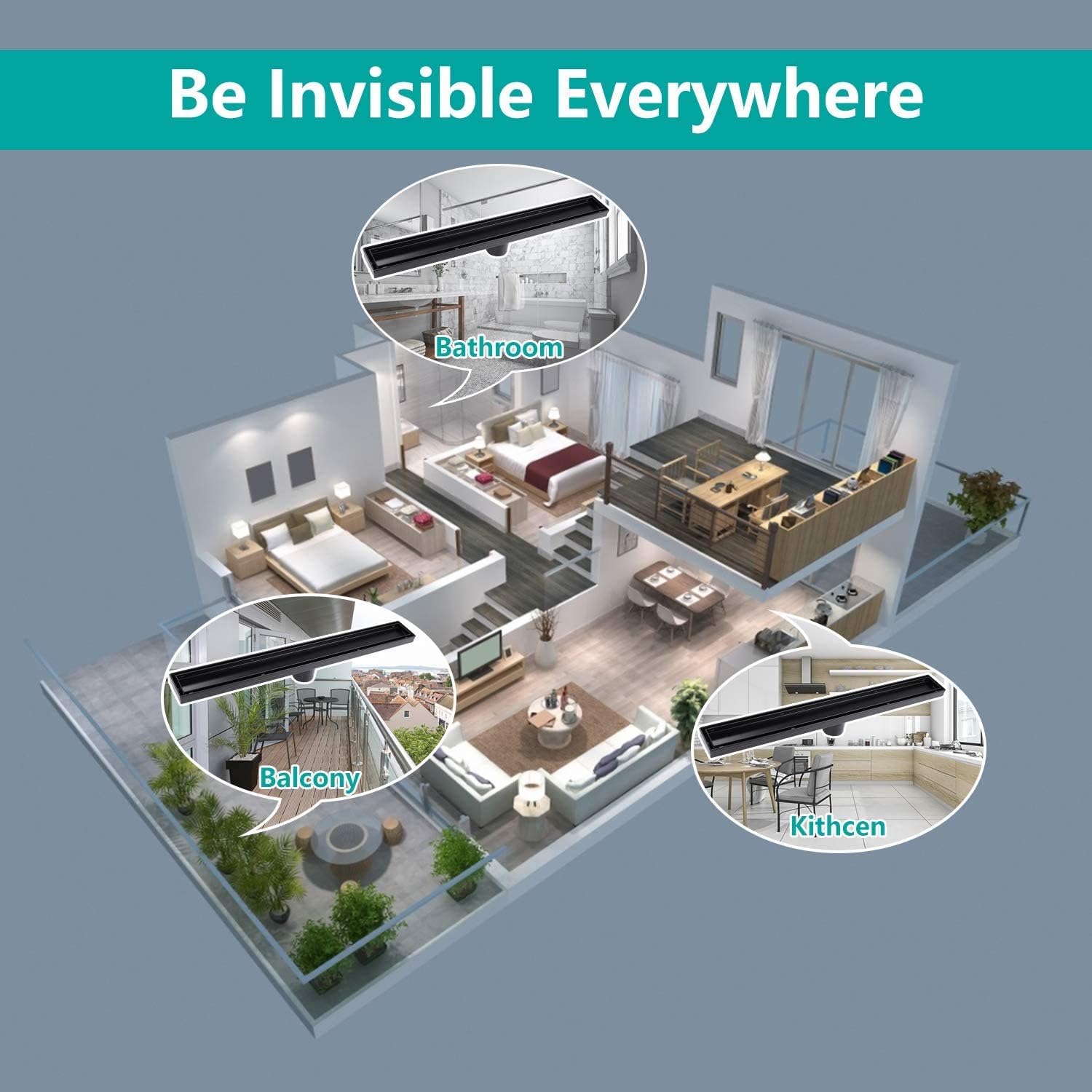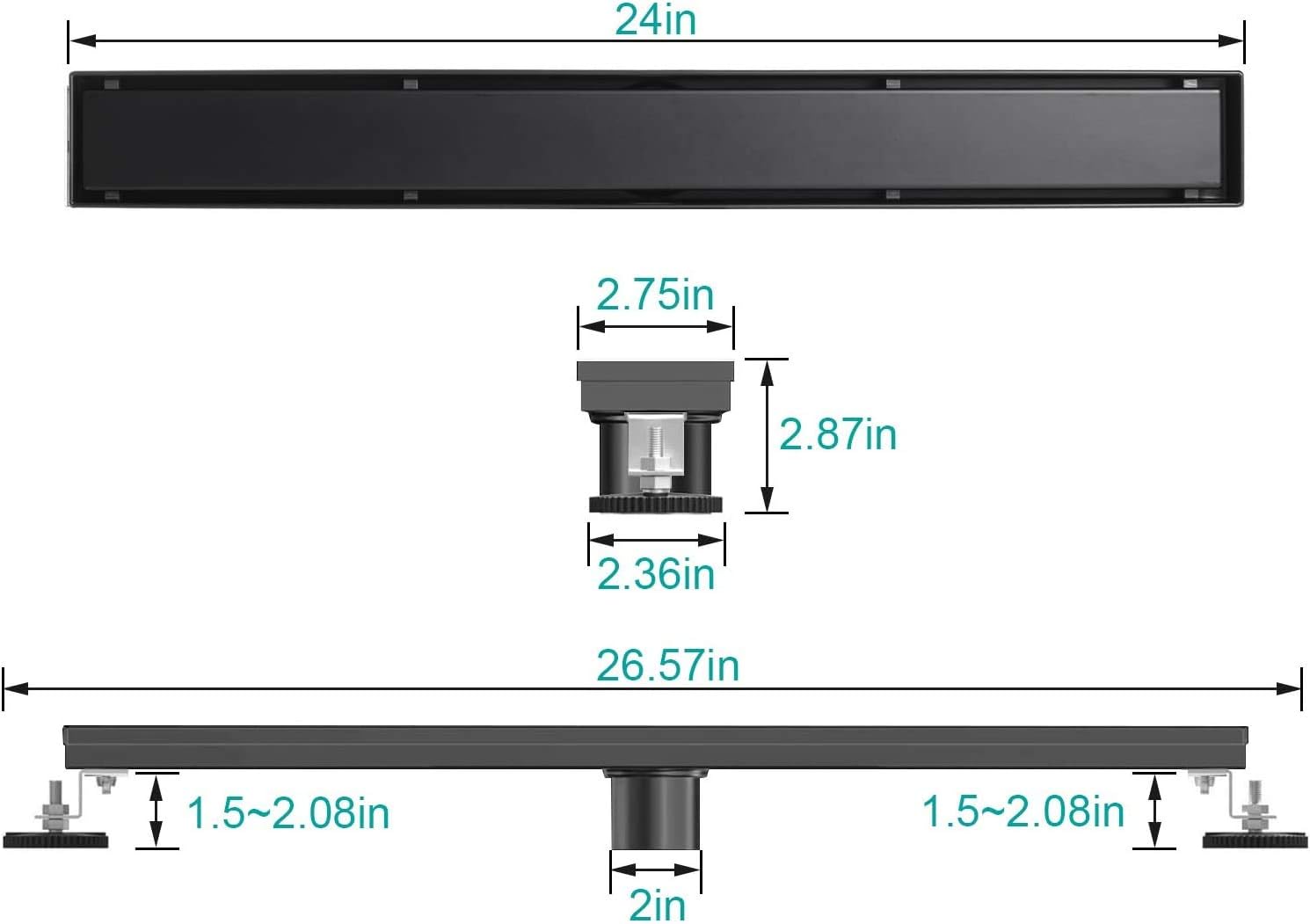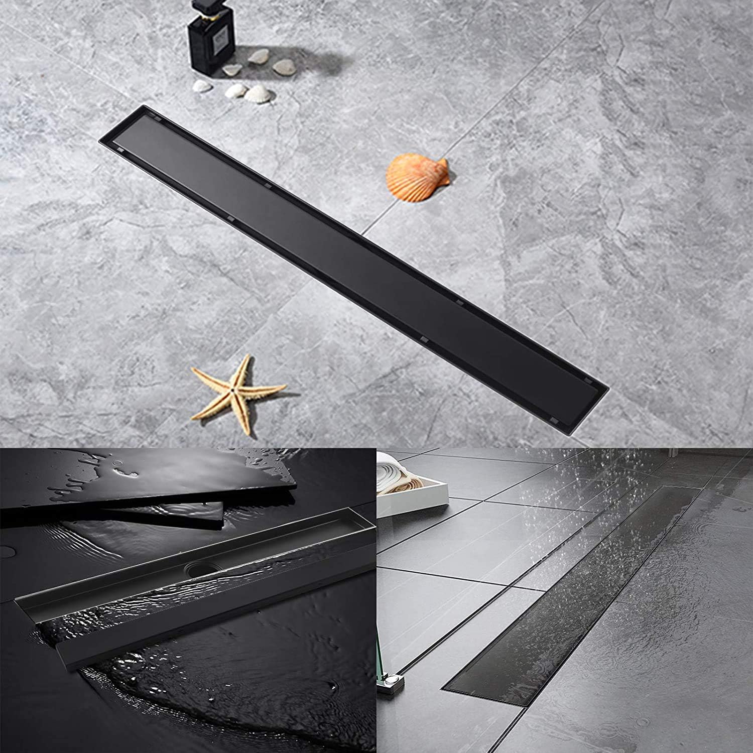 BARONAGE 24 Inch Linear Shower Drain, with 2-in-1 Flat & Tile, Insert Cover Black Brushed 304 Stainless Steel Rectangle Shower Floor Drain Adjustable Leveling Feet Hair Strainer CUPC Certified