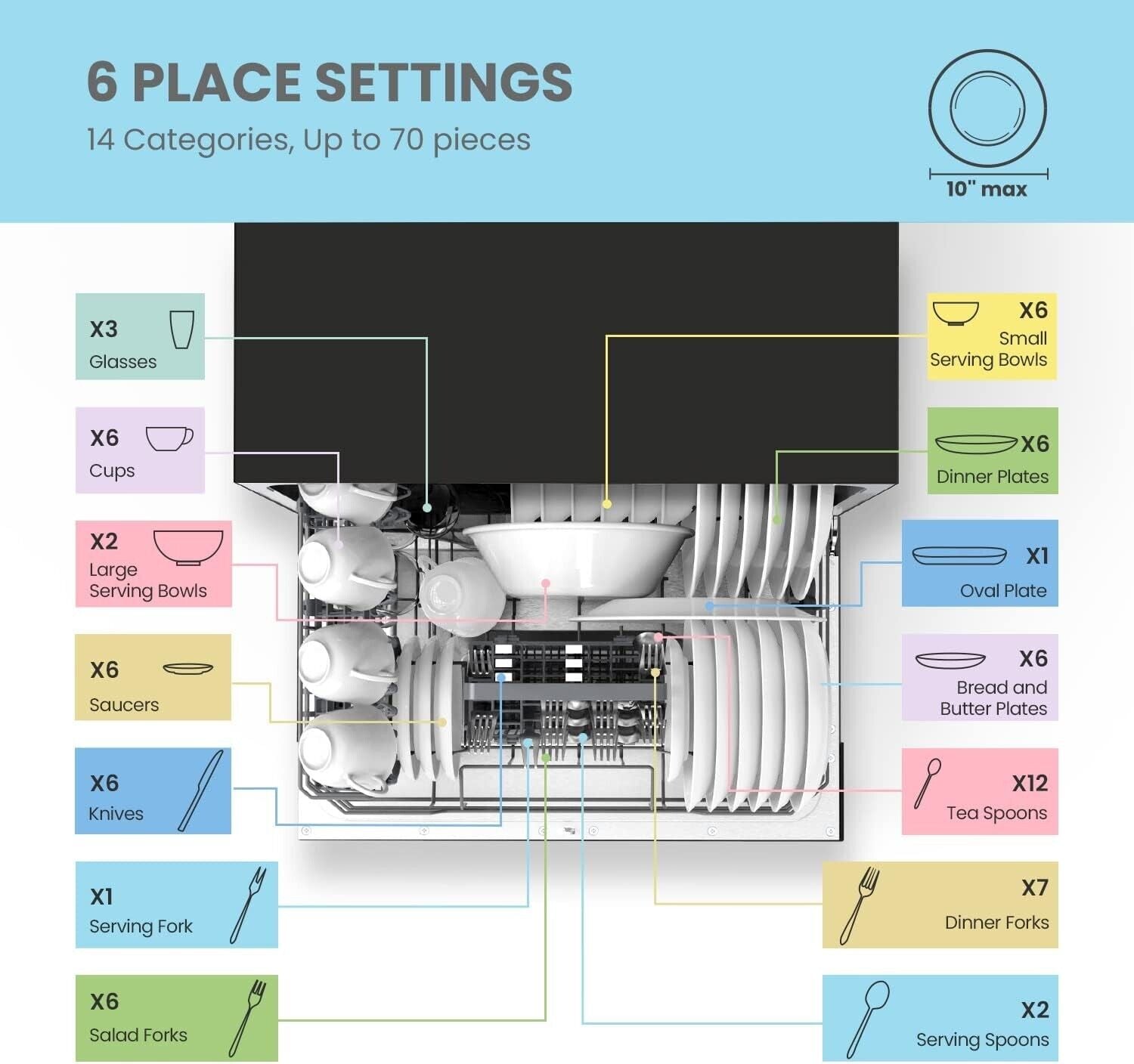* 【6 Place Setting】- A perfect size(H438×W550×D500mm) for 2-3 people, COMFEE’ compact dishwasher is suitable for dorms, RVs and apartments. This countertop dishwasher can fit up to 70 pieces of tableware, and a plate size of up to 10 inches diameter. Note: COMFEE dishwashers are tested at the factory before they are shipped. If your new dishwasher has some water inside, this is normal.