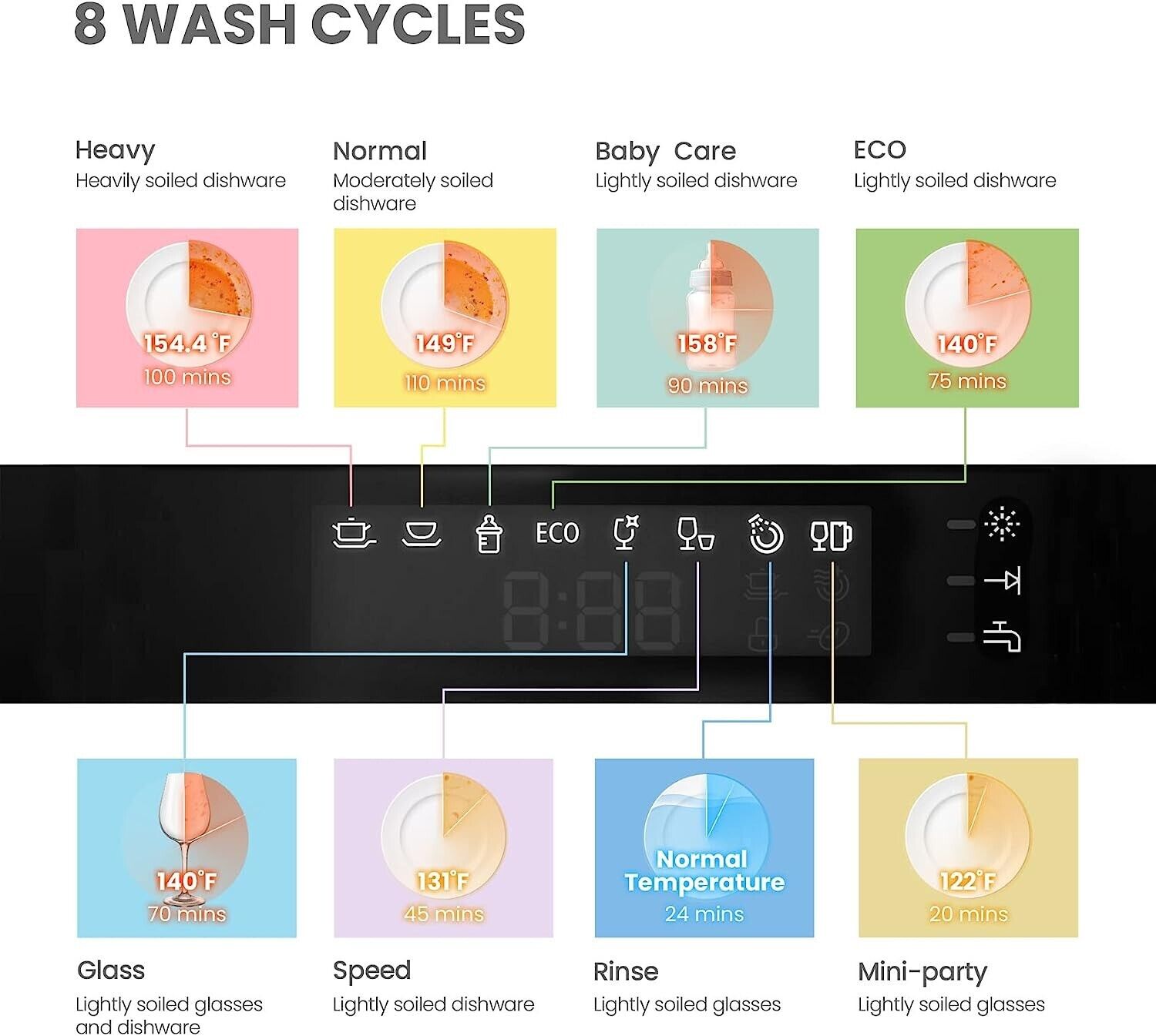 * 【8 Washing Cycles】- Most of the cleaning cycles, including Heavy, Normal, Baby-Care, ECO, Glass, and Speed, helped with extra-drying function, and deliver sparklingly cleaned and dried dishes. Three more cleaning options, including Speed, Mini-party, and Rinse, are designed for COMFEE' compact dishwasher, providing high flexibility for you to choose in different situations.