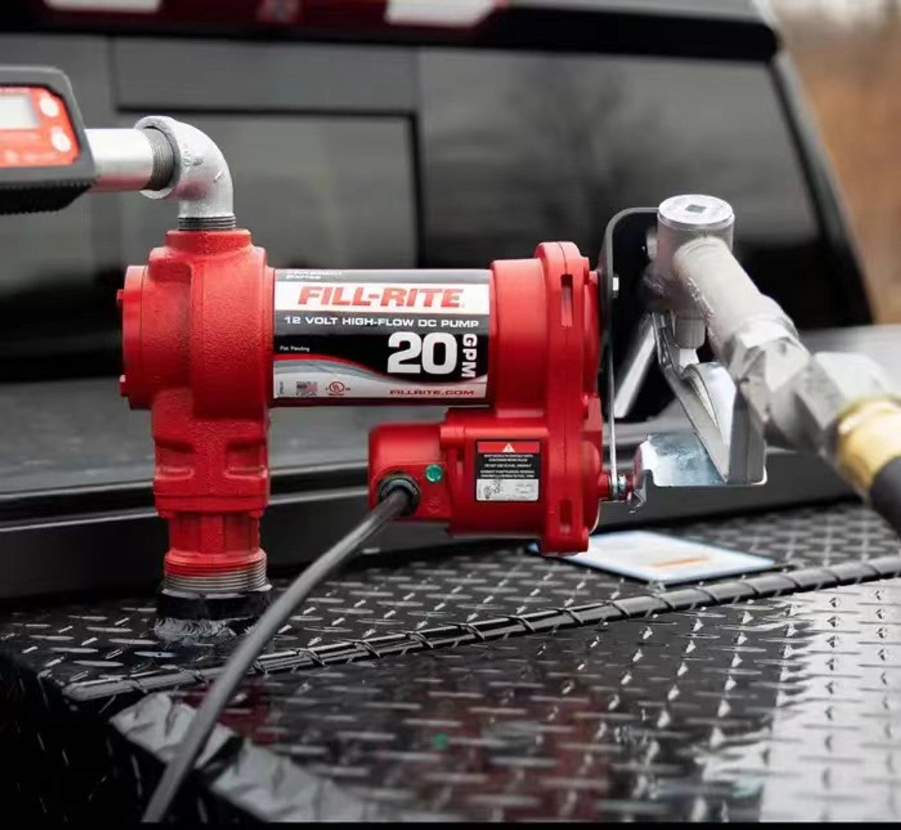 The FR4210HBFQ model is a 12V DC, 20 GPM, heavy-duty fuel transfer pump. This pump and accessory bundle comes complete with a filter, hose, nozzle, suction pipe, and installation components.