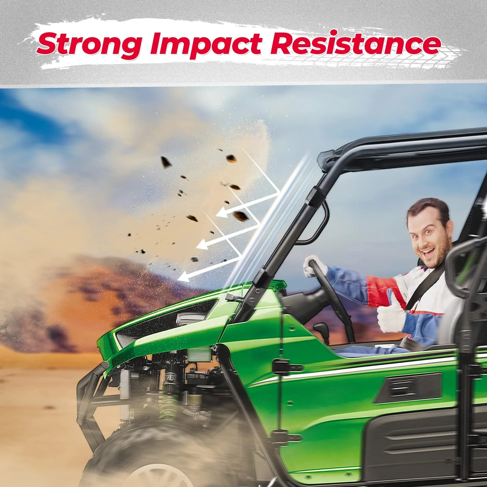 Full scratch resistant front windowshield for UTVs can protect you and your passengers from flying mud and debris from rear tires and prevents dust from being sucked into the cab.
