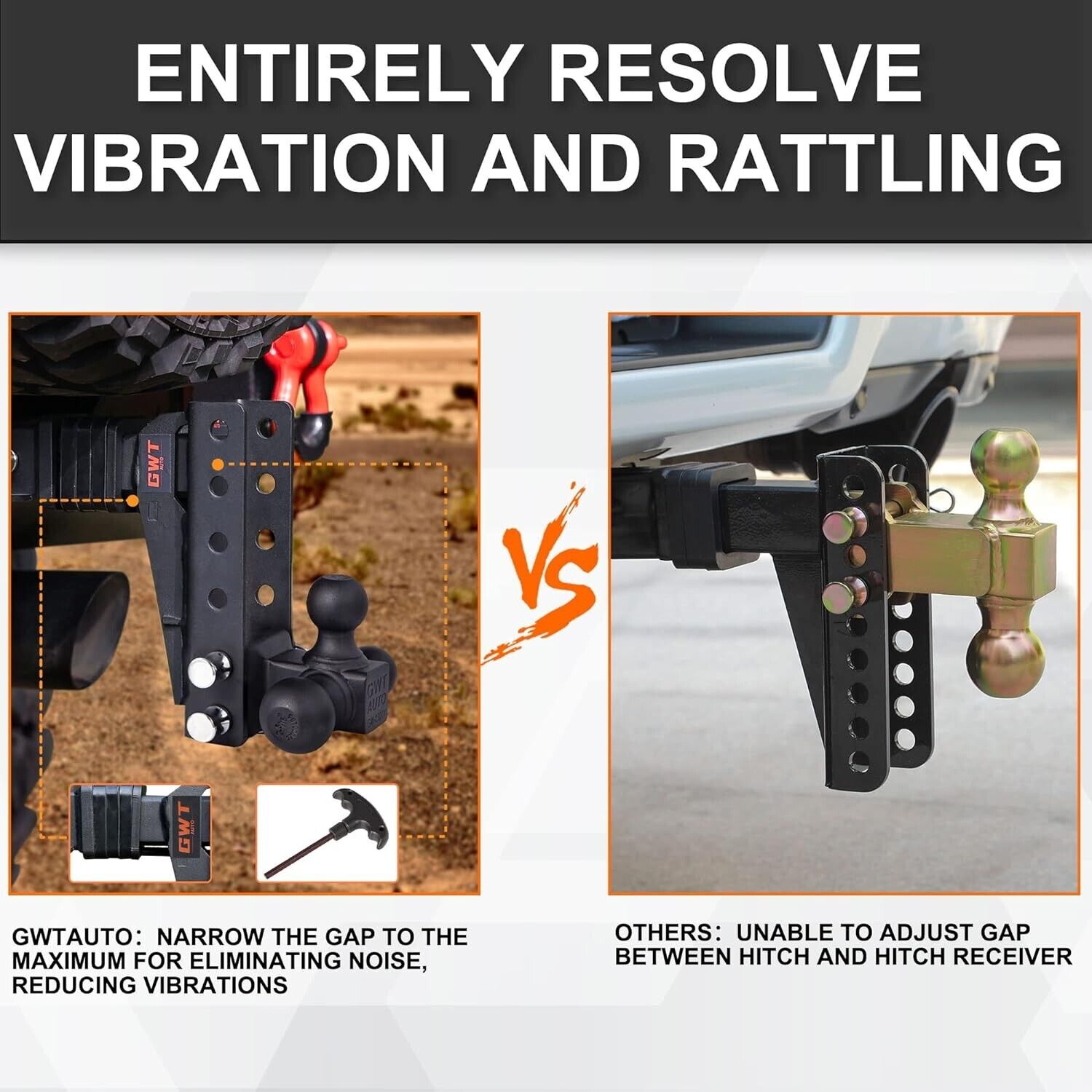 * SMOOTHER RIDING-The coordination of screw built in the ball mount and iron pad could narrow the gap between trailer hitch and hitch receiver through tightening the screws with hexagon wrench. The cushioned shim adhere to tri-ball is also designed for resisting rattling, wobbling, jolting, clunking, vibrations and especially the annoying noise while towing which brings the sensation of no trailer at the back.