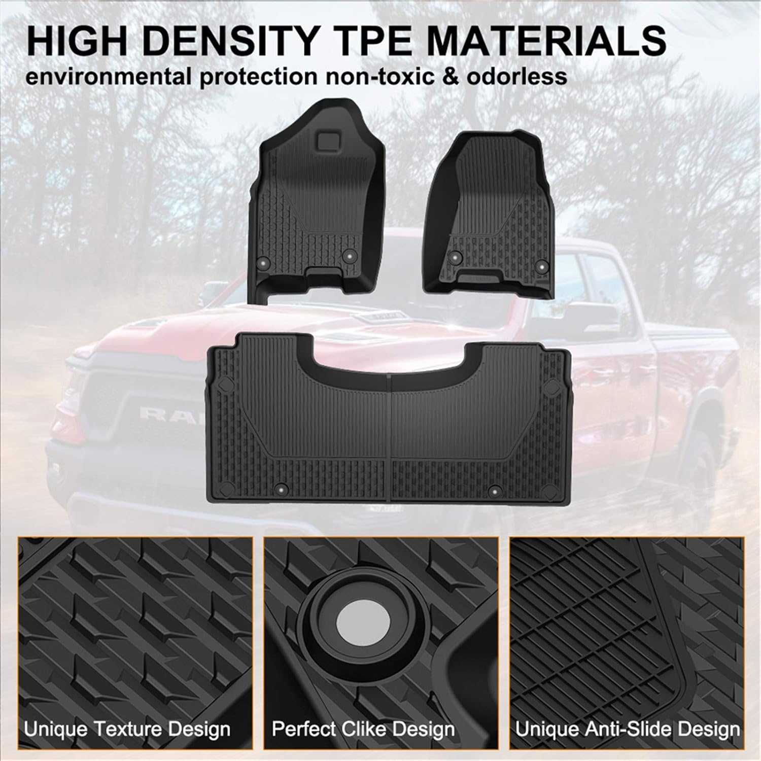 - ▶ ALL WEATHER FLOOR LINERS FOR RAM - The rugged and sporty floor mats perfectly conform to the contours of your ride and offer un-beatable carpet protection for whatever nature hurls at you. This unique design keeps mud, snow, water and debris off your vehicle's expensive, hard to clean carpet. Must-have floor mats to protect your vehicle from all of messes.