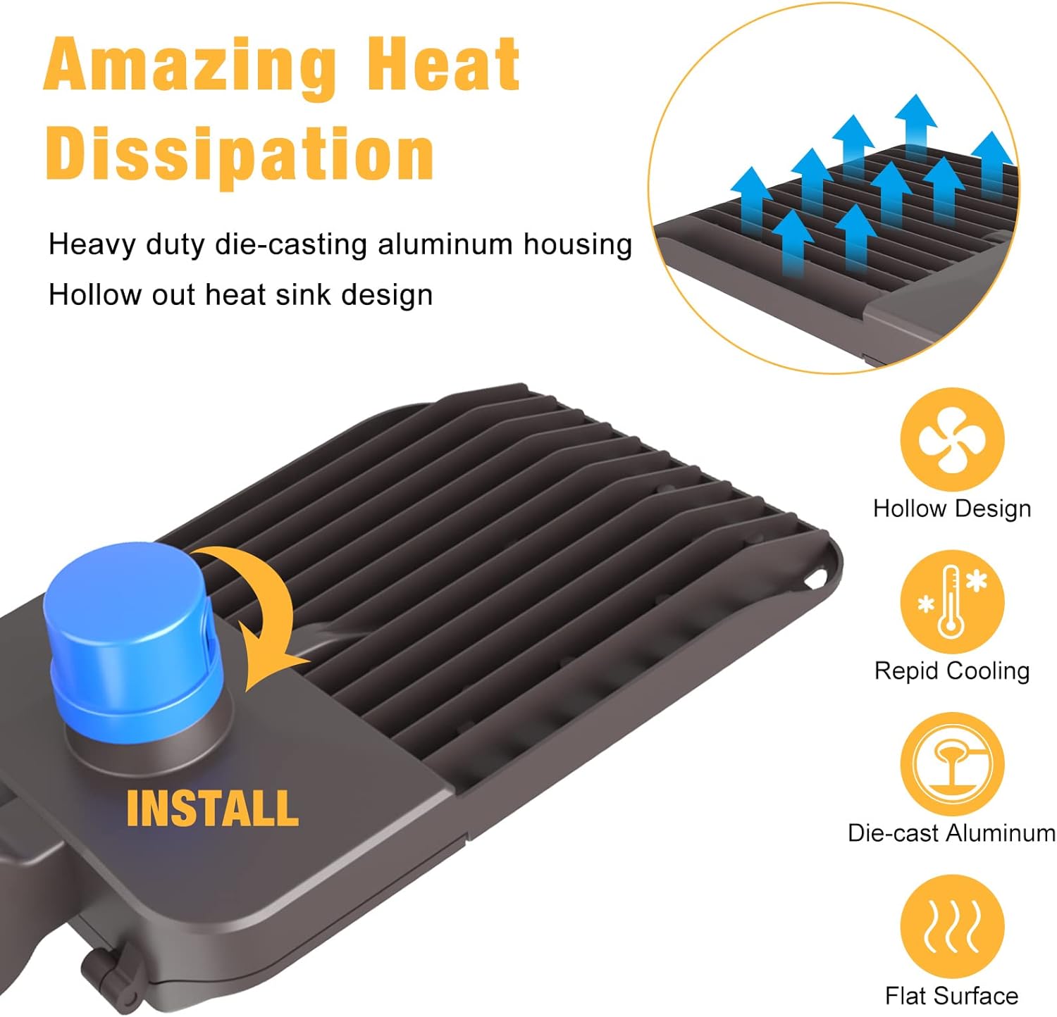 - 【All Weather Resistant】The outdoor LED shoebox area light is made of the die-cast aluminum structure, with excellent corrosion resistance & heat dissipation performance and professional IP65 waterproof design. Hollowed out heat sink design increases the heat dissipation surface and accelerates the air flow.