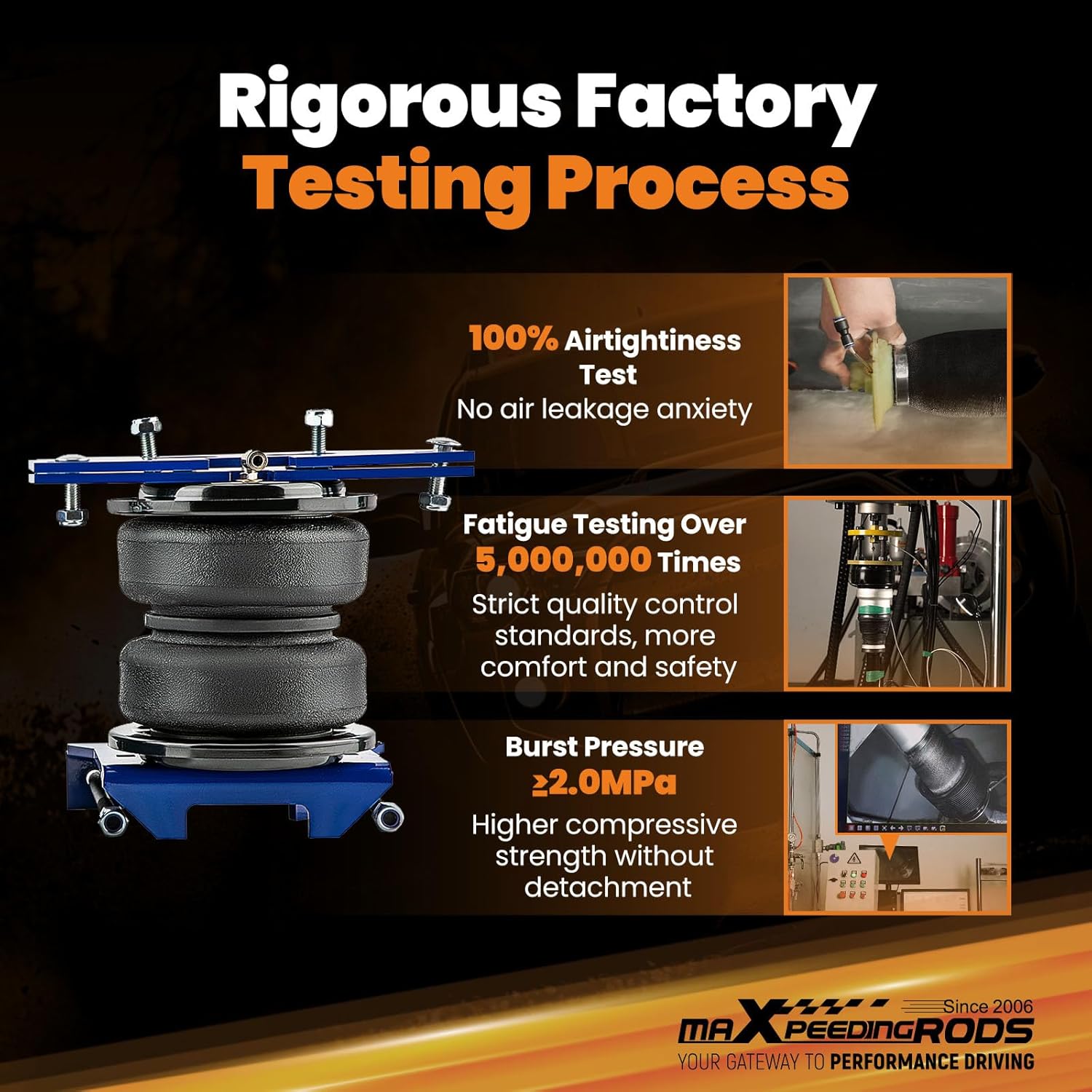 - 【REDUCE BUMPS ON RAOD】 - With internal jounce bumper inside, this kit can prevent air spring suspension kit from being completely compacted in the impact caused by heavy objects, potholes, curbs or objects on the road. Bsides it can reduce bouncing at the rear of the vehicle when towing and keep proper ride height