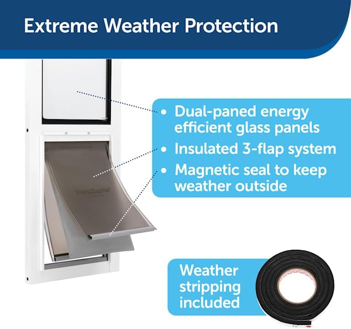 - ENERGY EFFICIENT: This energy-efficient sliding glass pet door has dual-paned glass, weather stripping and 3 insulating pet door flaps to keep the weather out and help optimize your energy bill