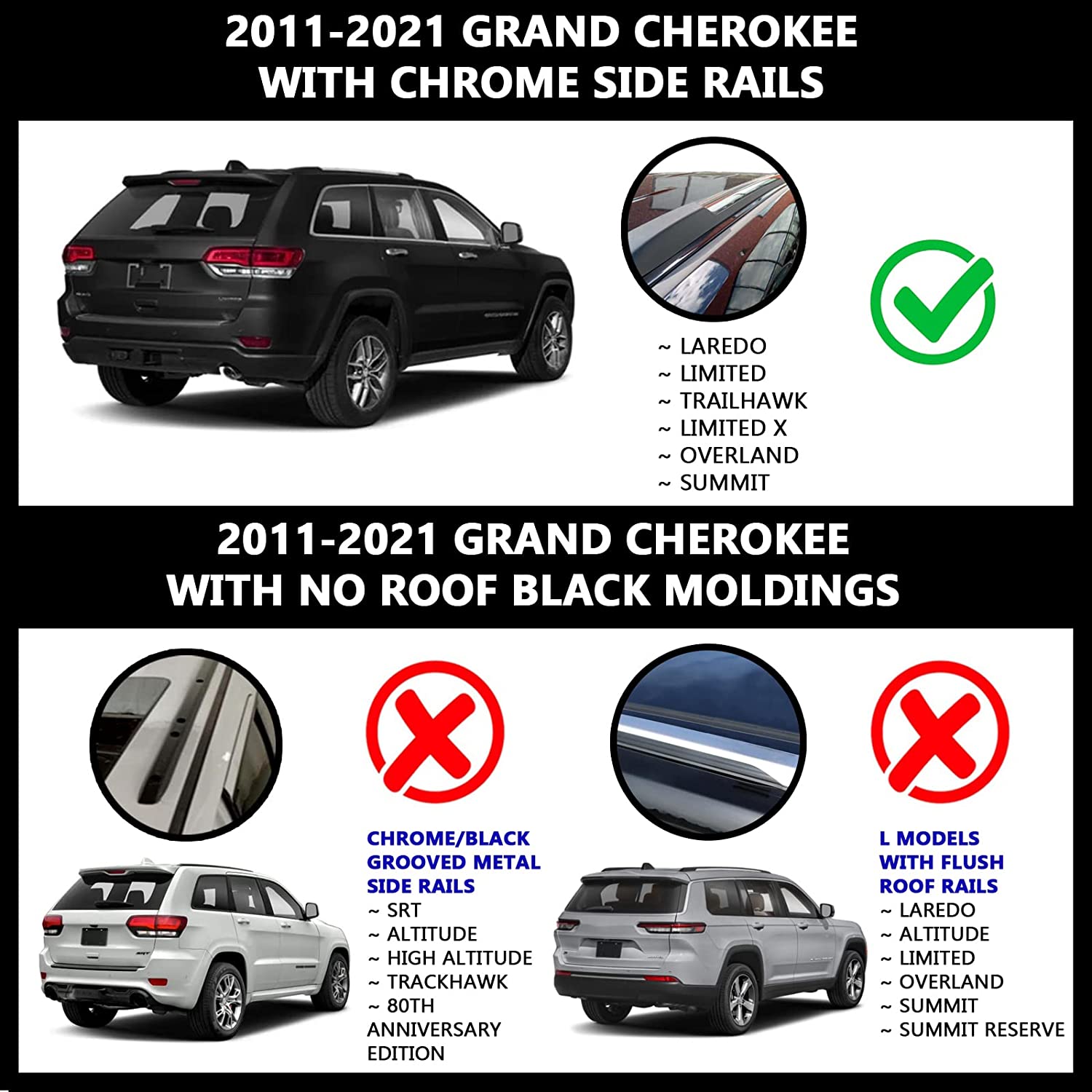 - ROOF RACK Fits The High Quality Premium Aluminum Crossbars Roof Rack Fits 2011 2012 2013 2014 2015 2016 2017 2018 2019 2020 2021 Jee-p Grand Cherokee WK2 Laredo, Limited, Trailhawk, Overland, Summit.(NOT Support SRT and Trackhawk)