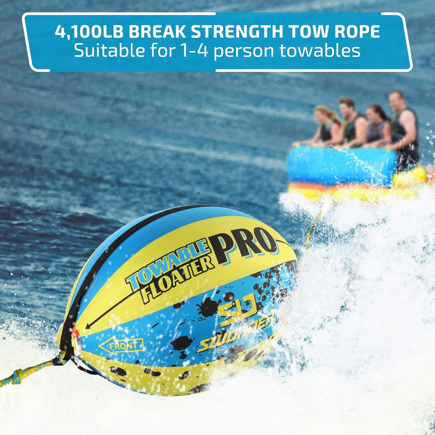 - Built Tough – Upgraded with a heavy-duty double-stitched full nylon cover and heavy-gauge PVC bladder, this towable floater Pro is built to last. Connects a 60ft long, 16-strand tow rope to both ends, it supports 4100 pounds break strength for 4 riders boat tube. Help it deliver fun and action for years to come.