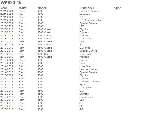 | 2021 | RAM | 1500 | BIG HORN, HFE, LARAMIE, LARAMIE LONGHORN, LIMITED, LIMITED LONGHORN, LONE STAR, LONGHORN, REBEL, SPECIAL SERVICE, TRADESMAN, TRX, TRX LAUNCH EDITION |