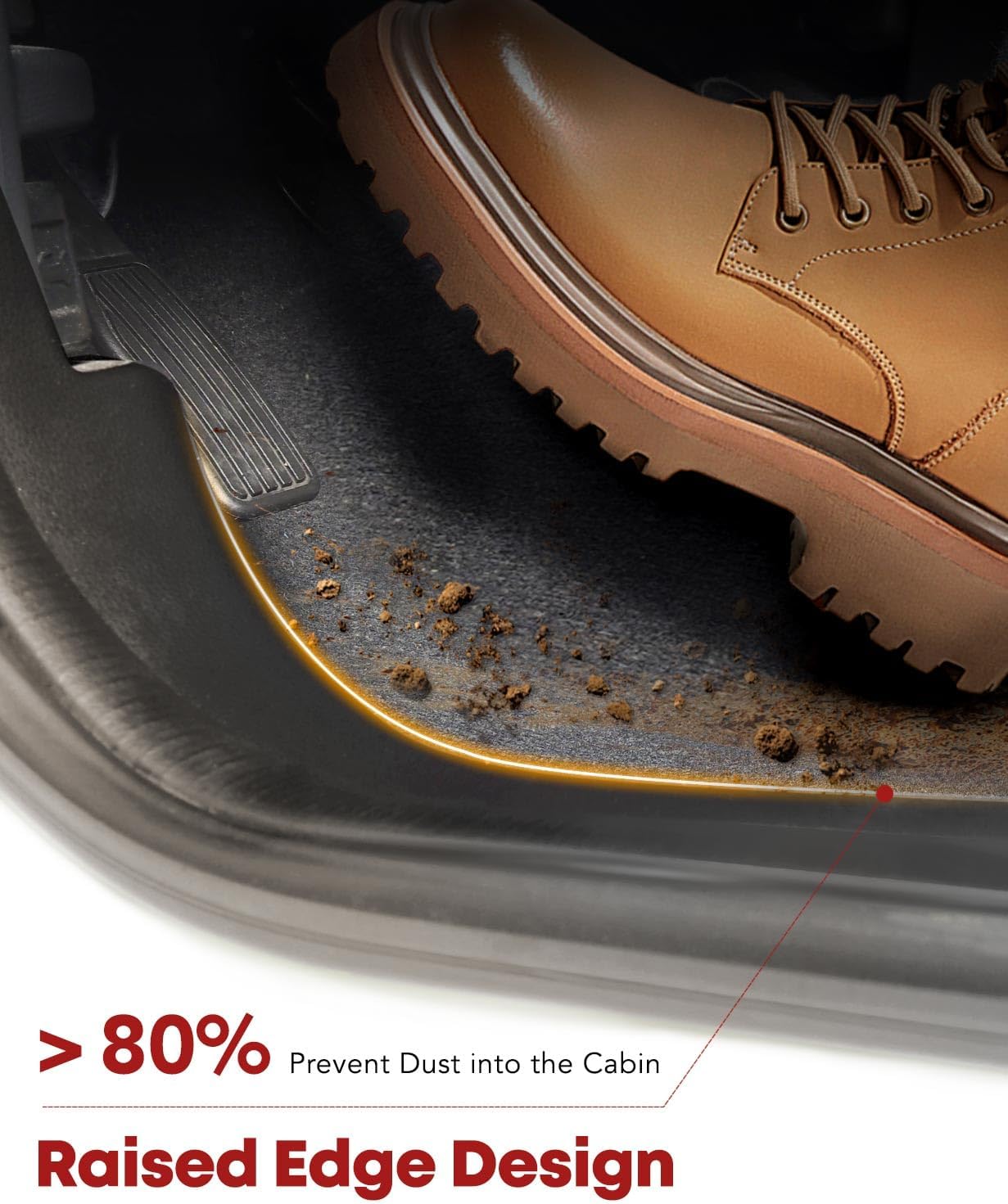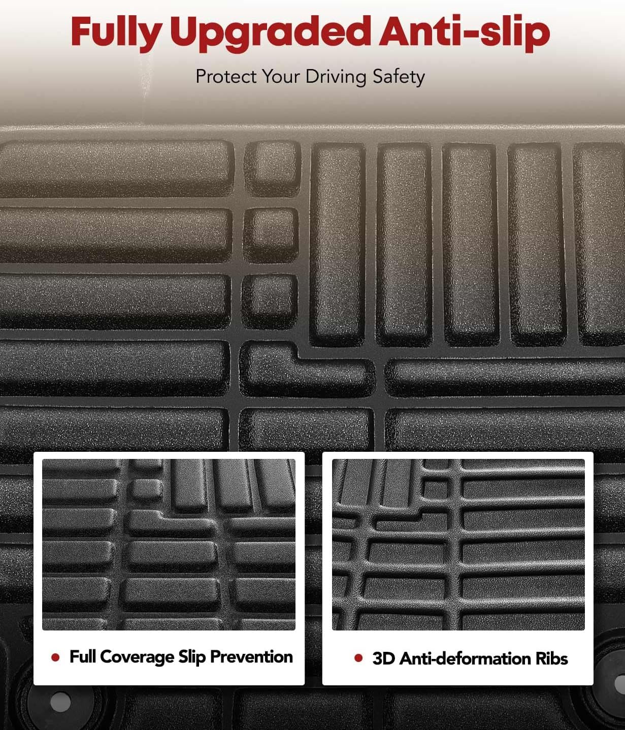 - Full Dimensional Protection: The floor mats has raised edges to effectively stow liquids and debris to keep your car clean; 3D laser scanning technology ensures that the floor liners provide a full range of fit. The anti-slip bottom design ensures that the mats will not shift during driving